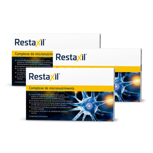 Restaxil® a été développé pour garantir un apport continu en micronutriments essentiels. Ce complément alimentaire de haute qualité combine les micronutriments éprouvés acide alpha-lipoïque (ALA) et choline avec l'ensemble du complexe de vitamines B ainsi que du calcium, soutenant ainsi une fonction nerveuse saine. La fonction principale des nerfs est la transmission des signaux, essentielle pour une réaction normale du corps aux stimuli et une sensibilité normale jusqu'au bout des orteils. Pour fonctionner correctement, les nerfs dépendent d'un apport quotidien en nombreux nutriments essentiels.